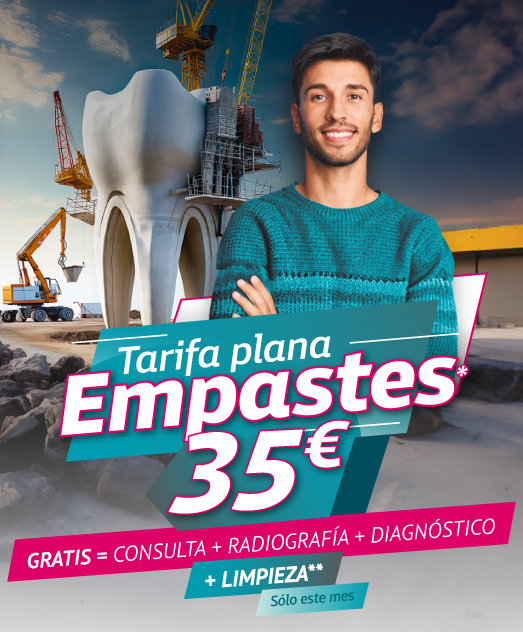 *Precio por empaste realizado. Se incluyen las obturaciones complejas y simples y las reconstrucciones. Quedan excluidas de la promoción las grandes reconstrucciones. **Servicio de limpieza gratuito sólo al contratar un tratamiento dental dentro del periodo de la promoción. Bajo prescripción del facultativo.Promoción válida desde el 01/01/2024 hasta el 31/01/2024. Promoción no acumulable con otras promociones. Más información en tu clínica Dental Company..